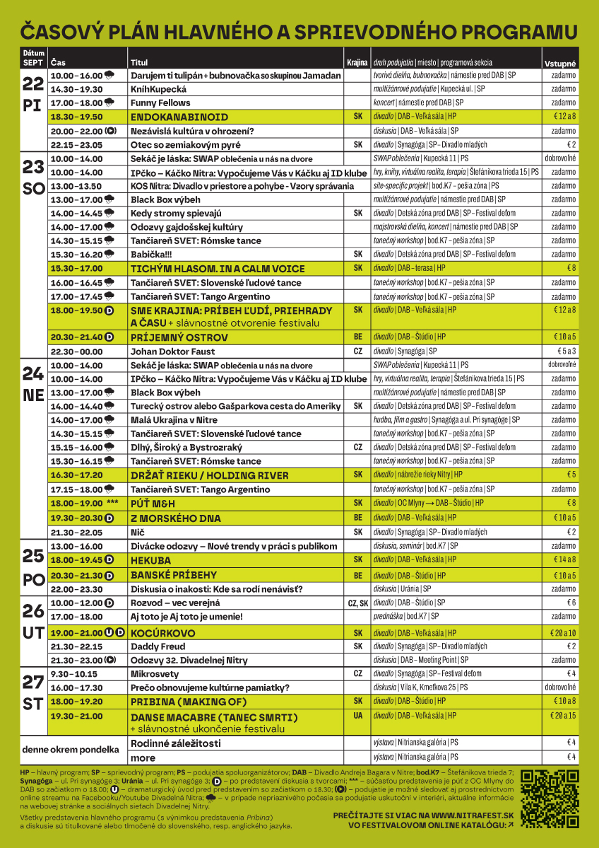 „Tematické okruhy scénických diel zaradených do hlavného programu 32. ročníka festivalu – ekológia, vojna, dejinné traumy, vzťah k tradíciám, ľudská osamelosť, vylúčenosť, hľadanie zmyslu existencie – nachádzajú odozvu v hlavnom aj sprievodom programe. Naprieč generáciami. Či, lepšie povedané, za účasti všetkých generácií: v sekciách Festival deťom, Divadlo mladých, v projektoch Aj toto je umenie, Darujem ti tulipán, Kníhkupecká, v ukážkach tradičných umení a remesiel i v nových formátoch, ako Tančiareň SVET a iné. Je pozoruhodné, ako sa na skúmaní postojov človeka a sveta podieľajú tvorcovia staršej, strednej i najmladšej generácie od reprezentatívnych scén až po amatérske alebo školské súbory,“ priblížila dramaturgiu festivalu jeho riaditeľka Darina Kárová.