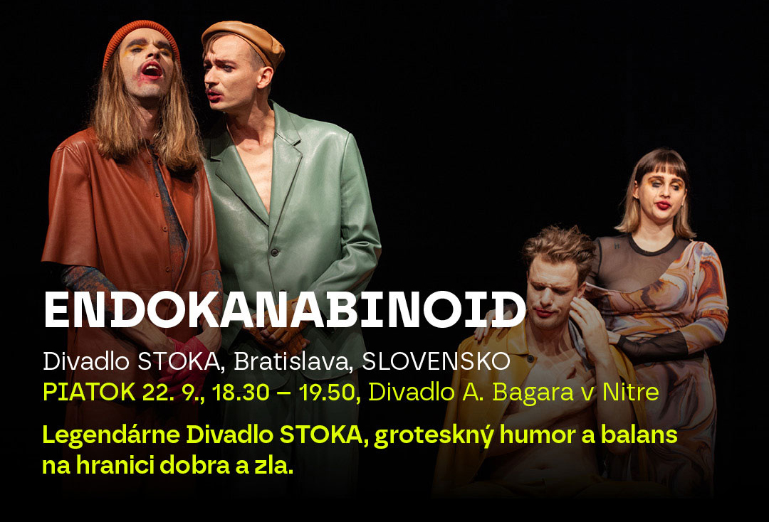 Divadelná Nitra 2023 sa koná týždeň pred predčasnými parlamentnými voľbami, v mesiaci Dňa ústavy, v roku 30. výročia vzniku republiky. Jedným z najvýraznejších kultúrnych fenoménov samostatnej Slovenskej republiky je Divadlo Stoka, ktoré zosobňuje tridsaťročný vývoj našej spoločnosti. Okrem iného aj preto, že silnou stránkou režiséra Blaha Uhlára je extrahovať v spolupráci s hereckým súborom esenciu doby, nech už je akákoľvek. Inscenácia Endokanabinoid, ktorá je prvým predstavením hlavného programu festivalu v piatok o 18:30, presne zachytáva svet, v ktorom prestali platiť elementárne pravidlá, kde si namiesto vízií vytvárame smerom k budúcnosti fóbie a napriek tomu sa dokážeme oddávať hedonizmu.