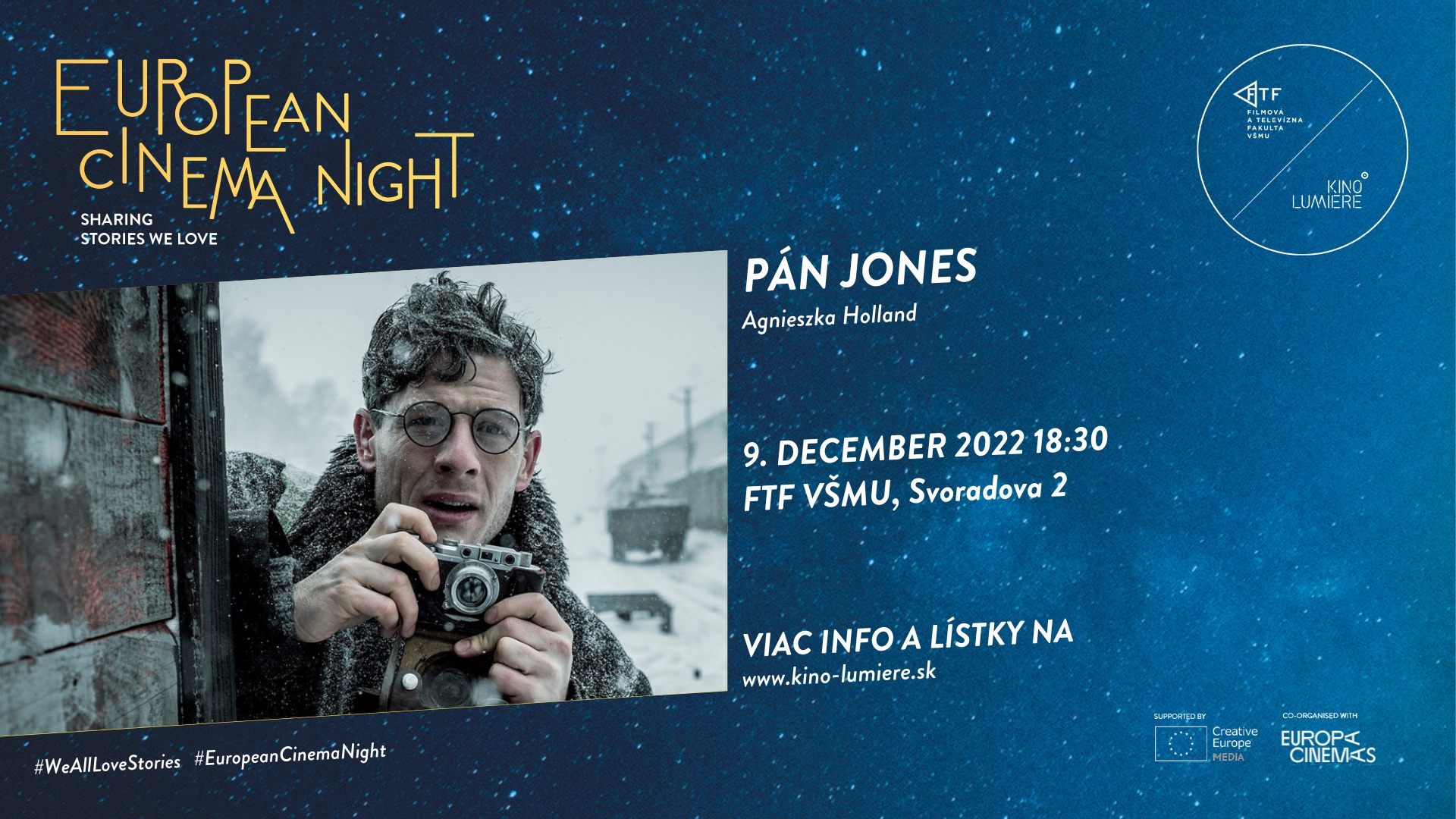 Kino Lumière sa tento rok po štvrtýkrát zapojí do medzinárodného projektu European Cinema Night, ktorého cieľom je osláviť mimoriadne európske filmy. V kine Klap na Filmovej a televíznej fakulte VŠMU v Bratislave uvedie film Pán Jones (2019) poľskej režisérky svetového mena Agnieszky Holland, ktorý hovorí o hladomore v 30. rokoch minulého storočia na Ukrajine. Projekcia sa uskutoční v piatok 9. decembra o 18.30 hod. a bude spojená s diskusiou v spolupráci s Ústavom pamäti národa. Lektorsky film uvedie filmová teoretička Katarína Mišíková. Vstup na podujatie je voľný.