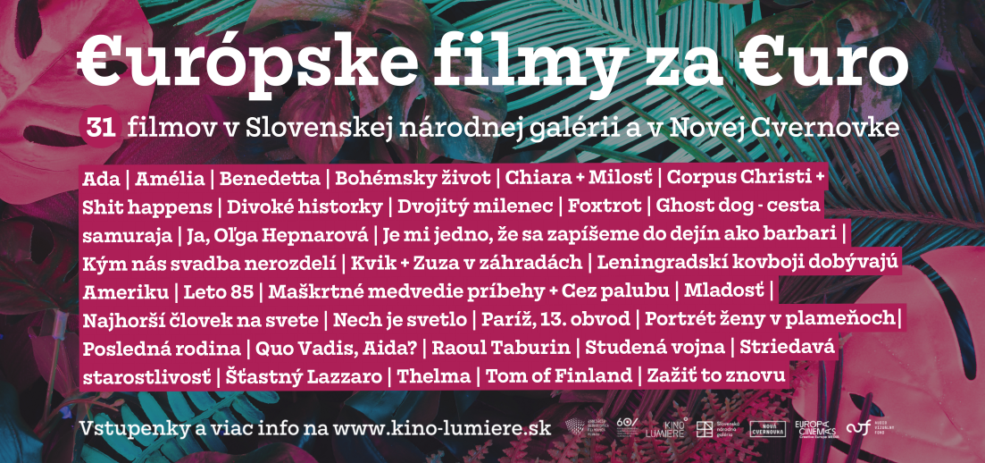 Projekt €urópske filmy za €uro bude možné od stredy 19. júla vidieť aj v Novej Cvernovke. V letnom kine Lumière pod Palmou ho odštartuje film Leto 85 (2020) francúzskeho režiséra Franocisa Ozona, ktorý sa zároveň premietne pod hlavičkou mesiaca PRIDE. Tradičný letný projekt kvalitných európskych filmov uvádza Kino Lumière od začiatku júla aj v kinosále Slovenskej národnej galérie, cyklus potrvá do konca augusta.