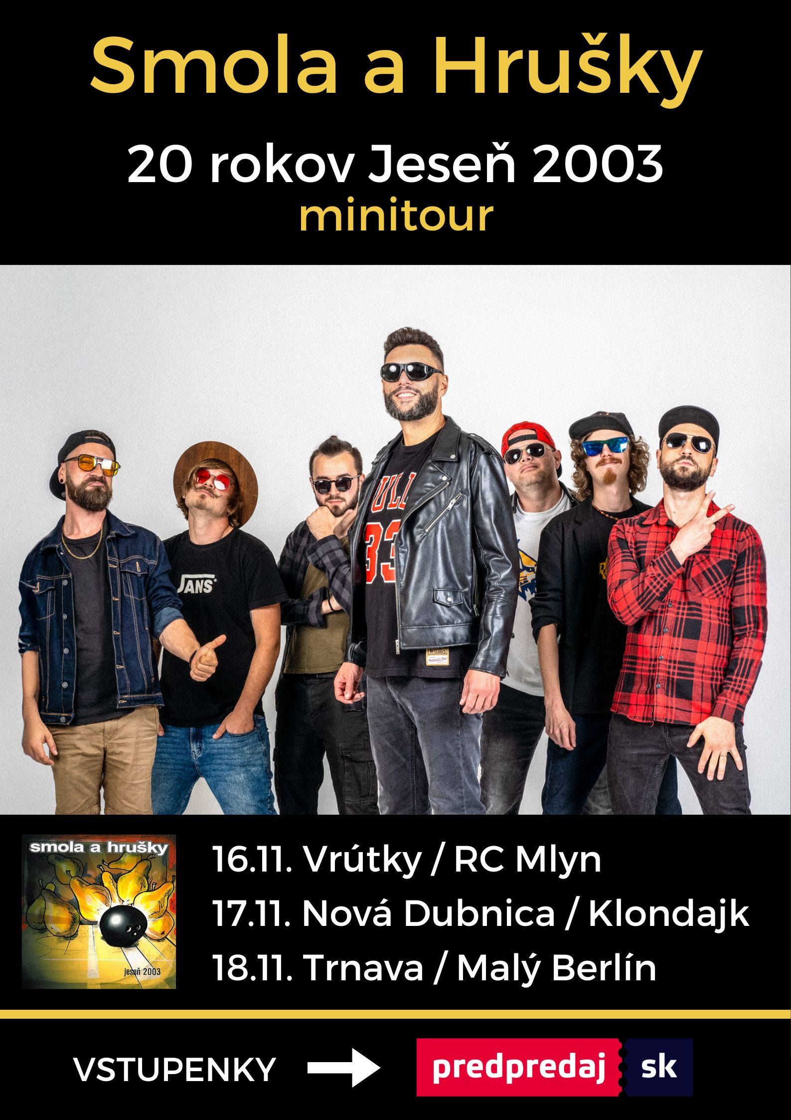 Kapela Smola a Hrušky oslavuje 20. výročie od vydania svojho prvého oficiálneho albumu s názvom Jeseň 2003. Fanúšikovia sa môžu tešiť na unikátny dvojhodinový koncertný set.