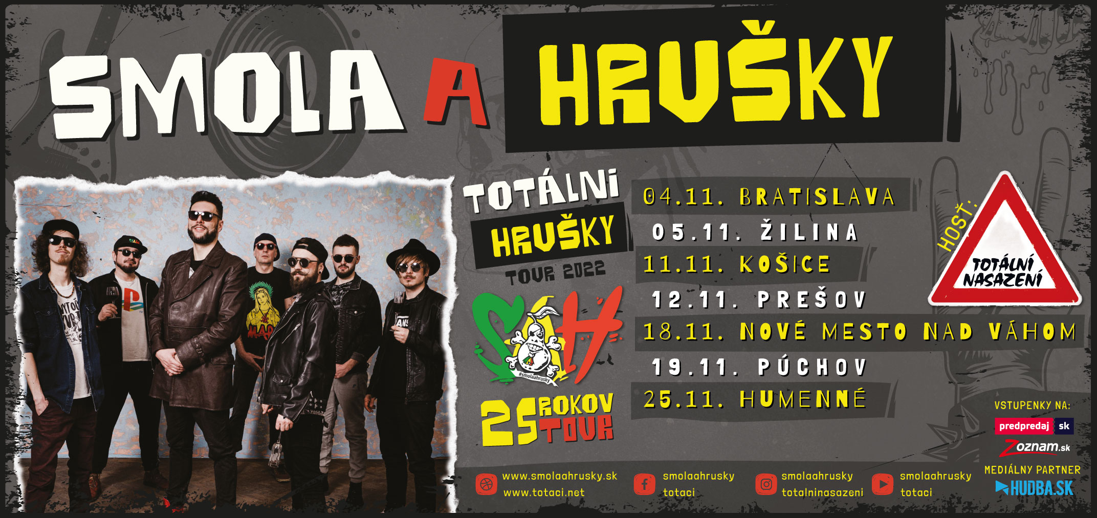 Kapela Smola a Hrušky oslavuje 25. výročie svojho vzniku a pokračuje v česko-slovenskom klubovom turné s názvom Totální Hrušky tour / 25 rokov Smola a Hrušky. Po dvoch rokoch núteného preloženia to do tretice vyšlo. Ako hosť sa v rámci slovenských zastávok predstaví česká legenda z mesta Slaný, kapela Totální Nasazení, ktorá pôsobí obdivuhodných 32 rokov na českej punk-rockovej scéne. Klubové turné má za sebou spoločné skvelé koncerty v českých mestách: Daskabát, Praha, Brno, Pardubice a Most. Smola a Hrušky vyzýva fanúšikov, aby prišli podporiť slovenské koncerty a nielen kapely, ale aj kluby a scénu, pretože bez nich to nemôže a ani nebude fungovať. Svoje posledné slovenské klubové turné na dlhšie obdobie začalo v piatok 4.11. v Bratislave – Randal club a v sobotu 5.11. v Žiline – Smer klub 77. Ďalej turné pokračuje v mestách: Košice, Prešov, Nové Mesto nad Váhom, Púchov a Humenné, a obe kapely sa tešia na všetkých skalných aj nových fanúšikov.