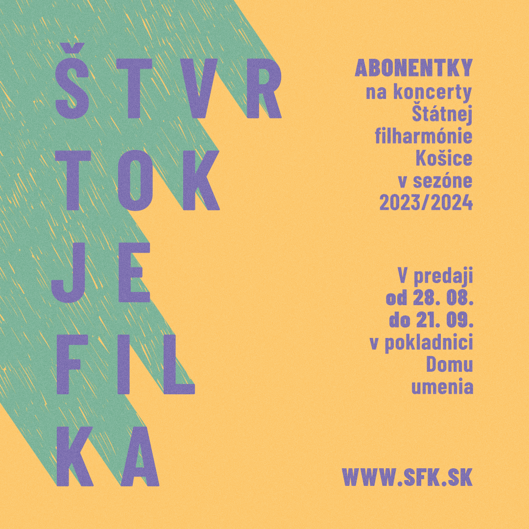 Čo si dnes s abonentkou zaistíte, v sezóne akoby ste našli! Hlási Štátna filharmónia Košice a spúšťa predaj zvýhodnených sezónnych vstupeniek. Abonentky na 55. koncertnú sezónu sú v predaji od 28. augusta do 21. septembra 2023 v pokladni Domu umenia.
