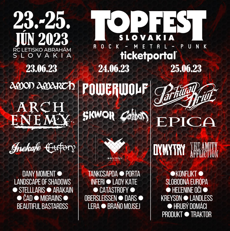 Fanúšikom rocku, metalu a punku netreba doteraz potvrdených interpretov na TOPFEST SLOVAKIA 2023 predstavovať. Čerešničkou na torte sú zahraniční headlineri. Na pódiu sa predstavia švédske kapely Amon Amarth a Arch Enemy, holandská kapela Epica, nemecká partia Powerwolf a z ďalekej Austrálie príde energická zostava Parkway Drive. Nechýba to najlepšie zo slovenskej a českej scény: Slobodná Európa, Iné Kafe, Konflikt, Kreyson, Škwor, Dymytry.