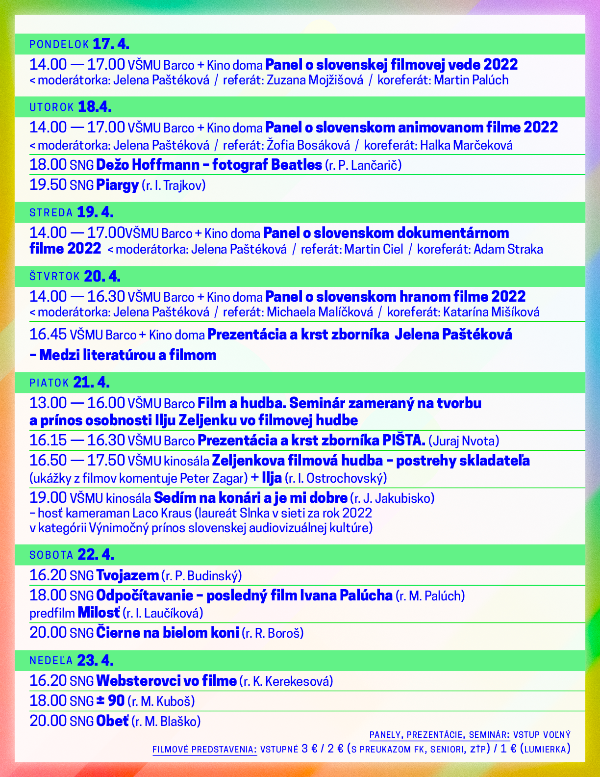 Prehliadka Týždeň slovenského filmu každoročne bilancuje tvorbu predchádzajúceho roka prostredníctvom filmov a ich kritickej reflexie. Tohtoročný program tvoria filmy nominované na národnú filmovú cenu Slnko v sieti, panelové diskusie o hranom, dokumentárnom, animovanom filme a o filmovej vede a tiež seminár venovaný slovenskému hudobnému skladateľovi Iljovi Zeljenkovi. Prehliadka sa uskutoční od 17. do 23. apríla 2023 v priestoroch Filmovej a televíznej fakulty Vysokej školy múzických umení v Bratislave a v kinosále Slovenskej národnej galérie.
