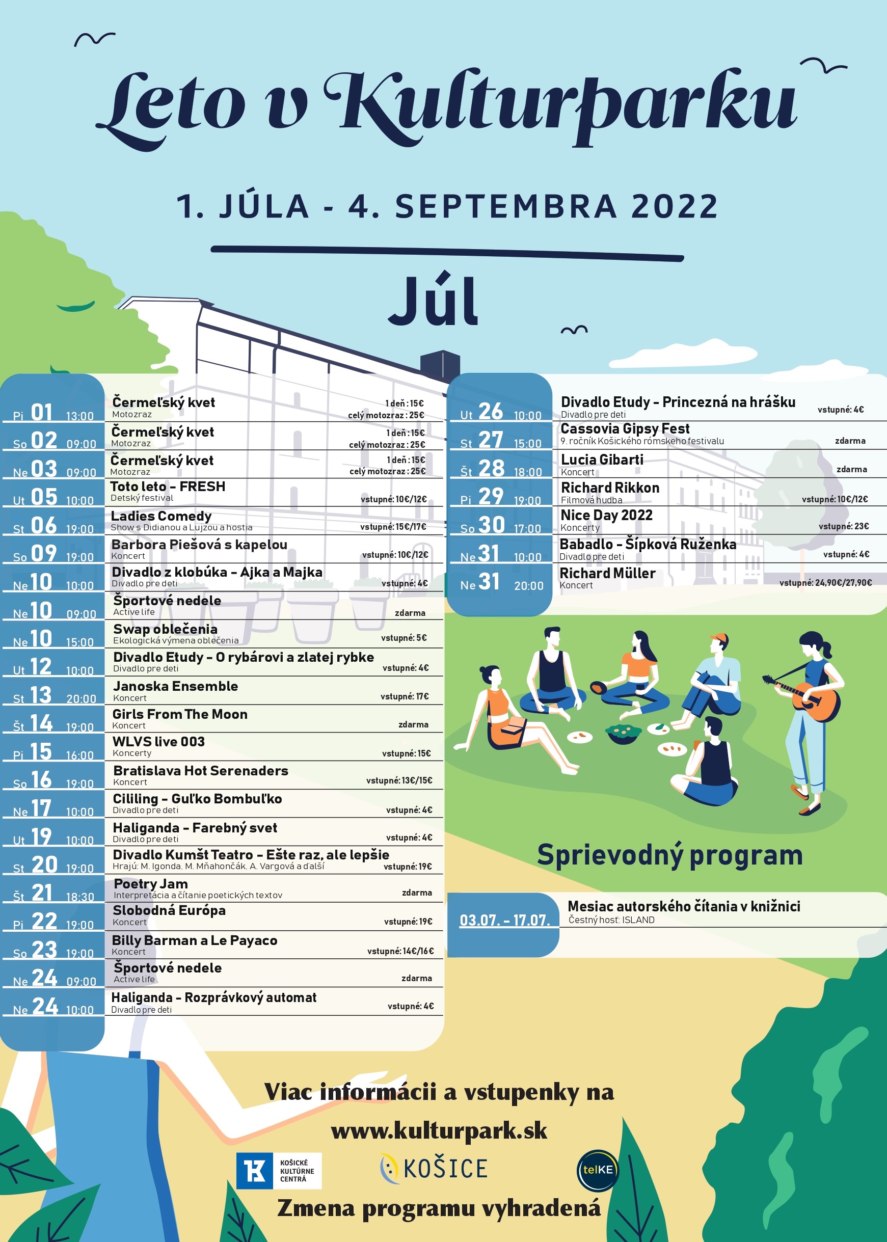 Čo nás čaká v nasledujúcich mesiacoch? Odpoveďou sú headlineri, bez ktorých si Leto v Kulturparku ani nevieme predstaviť. Nabudí vás zraz motorkárov Čermeľský kvet. Osviežiť humorom prídu Didiana s Lujzou a ich Ladies Comedy, ale nalaďte sa tiež na Stand-up Comedy. Do Košíc sa chystá aj známa štvorica muzikantov Janoska Ensemble. Pre mladú generáciu chystá koncert WLVS live 003, vzácnymi hosťami budú Bratislava Hot Serenaders. Divadlo Kumšt Teatro sa predstaví hrou Ešte raz, ale lepšie. Vychutnáte si aj koncerty Billyho Barmana a Le Payaco, Richarda Müllera, IMT Smile, Bobana Markoviča a skupiny Vidiek, Richarda Rikkona, Barbory Piešovej, ale aj vystúpenie Kalusch Orchestra.