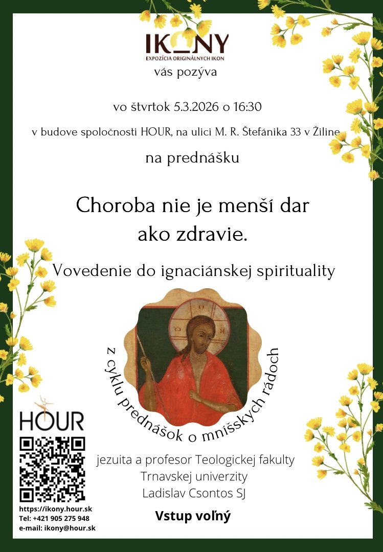 Môže byť choroba darom? Pozývame vás hľadať odpovede spolu s ocom Ladislavom Csontosom SJ. Prednáška „Choroba nie je menší dar ako zdravie“ vás vovedie do tajov ignaciánskej spirituality. Stretneme sa v štvrtok 5. marca o 16:30 v Galérii IKONY. Príďte si po povzbudenie pre dušu.
