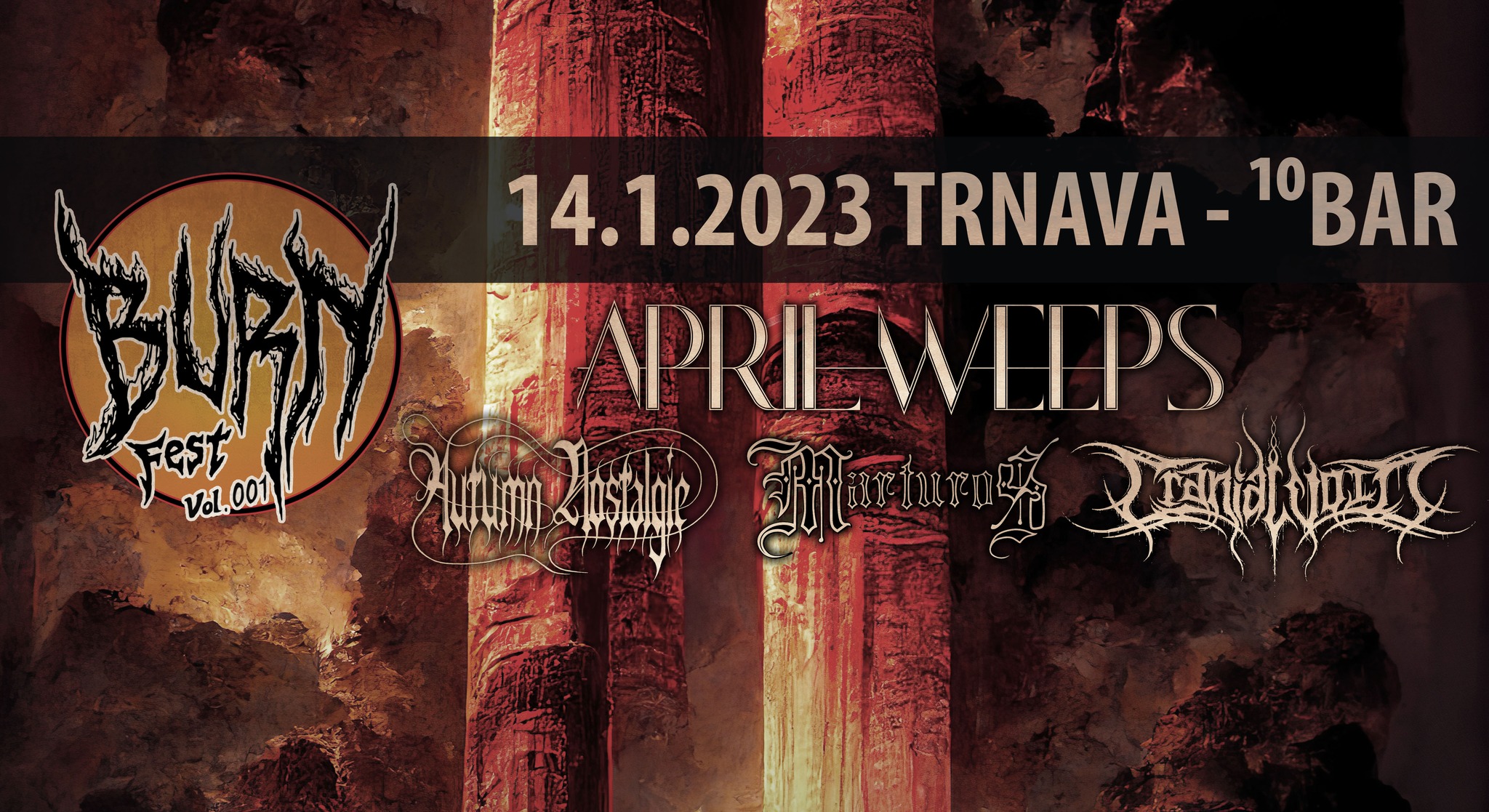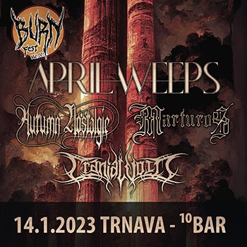 Začiatkom nového roku prinesie BURN Booking do Trnavy prvý zo série koncertov s názvom BURN FEST. Na koncerte sa predstaví špička slovenskej metalovej scény - kapely April Weeps, Autumn Nostalgie, Marturos a Cranial Void. Príďte sa zabaviť a ochutnať všehochuť metalových subžánrov, všetko od vynikajúcich slovenských kapiel.