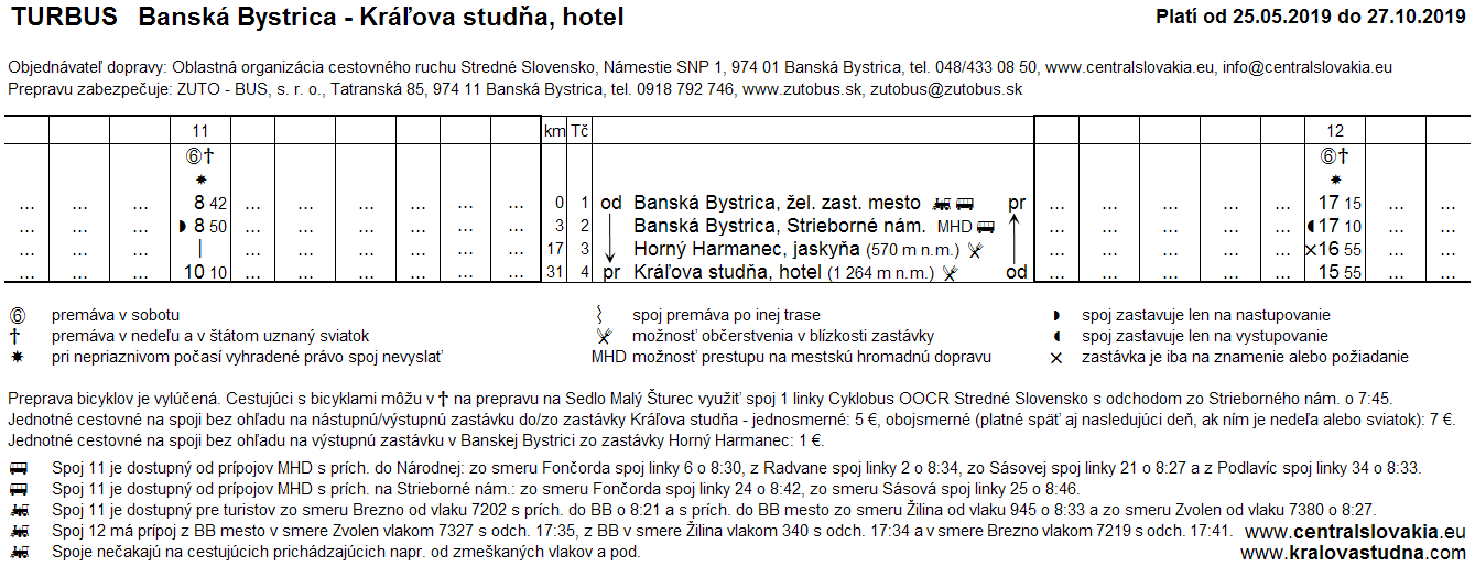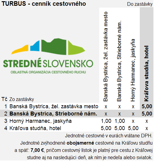 Turbus premáva po trase Železničná zastávka mesto (malá stanica) - Strieborné námestie - Horný Harmanec (len v smere dole) - Kráľova studňa s pravidelným odchodom 8:42 z Banskej Bystrice a 15:55 z Kráľovej studne. Plánovaný príchod na Horský hotel Kráľova Studňa je približne o 10:10 a naspäť do Banskej Bystrice približne o 17:15.