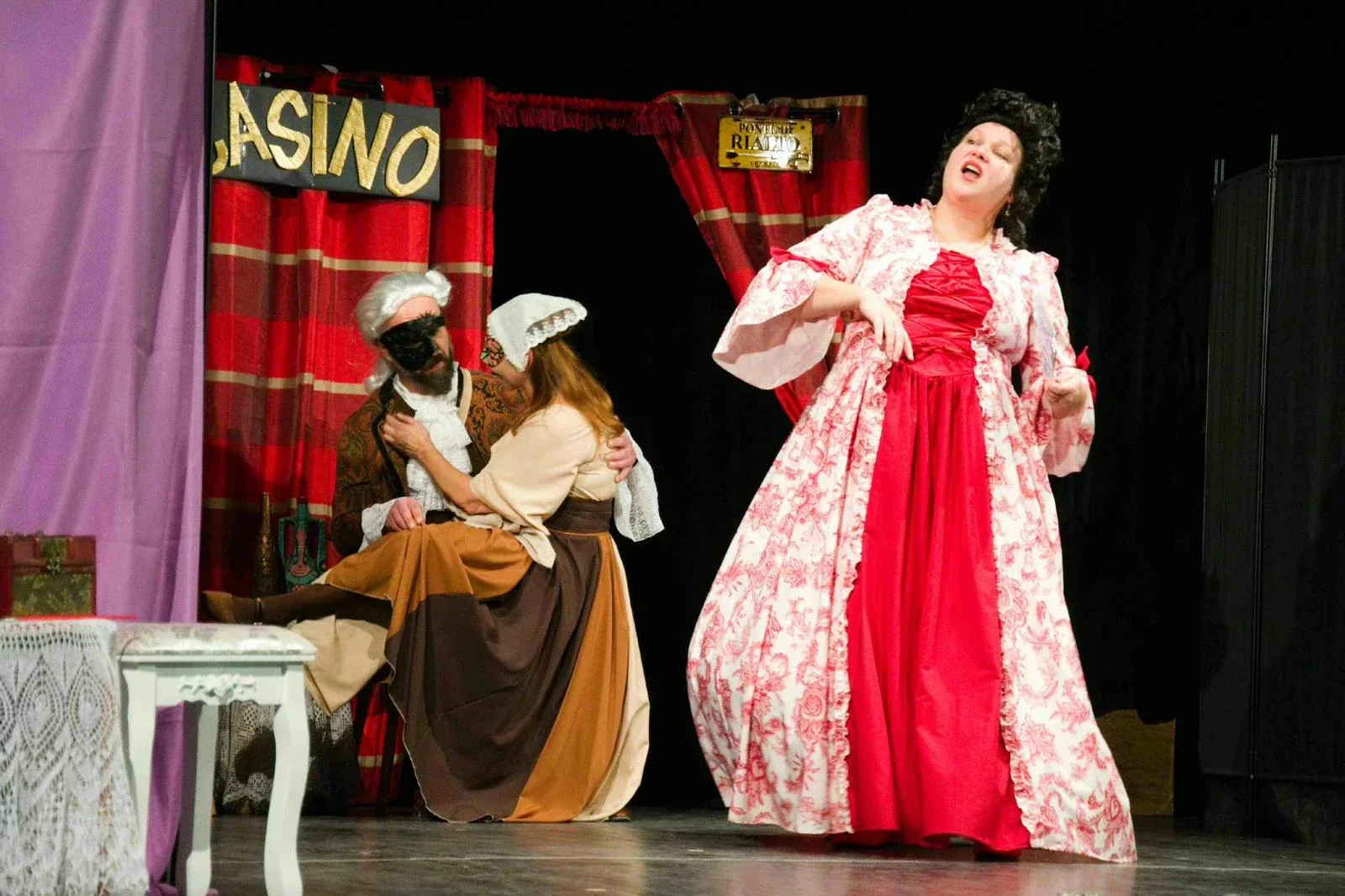 Dej komédie sa odohráva počas benátskeho karnevalu, čo sa odráža aj v bohatej vizuálnej stránke inscenácie plnej farebných kostýmov, parochní, masiek, flirtovania, žiarlivostných scén, hádok a typických talianskych manželstiev. Postupne vychádza najavo pravda o návštevách mužov u peknej vdovičky Lucrezie a ukáže sa, že podozrenia žien boli celkom bezdôvodné. Inscenácia zároveň poukazuje na dôvtip a šarm, ktorými ženy dokážu dosiahnuť svoj cieľ. Na začiatku šum, na konci tanec.