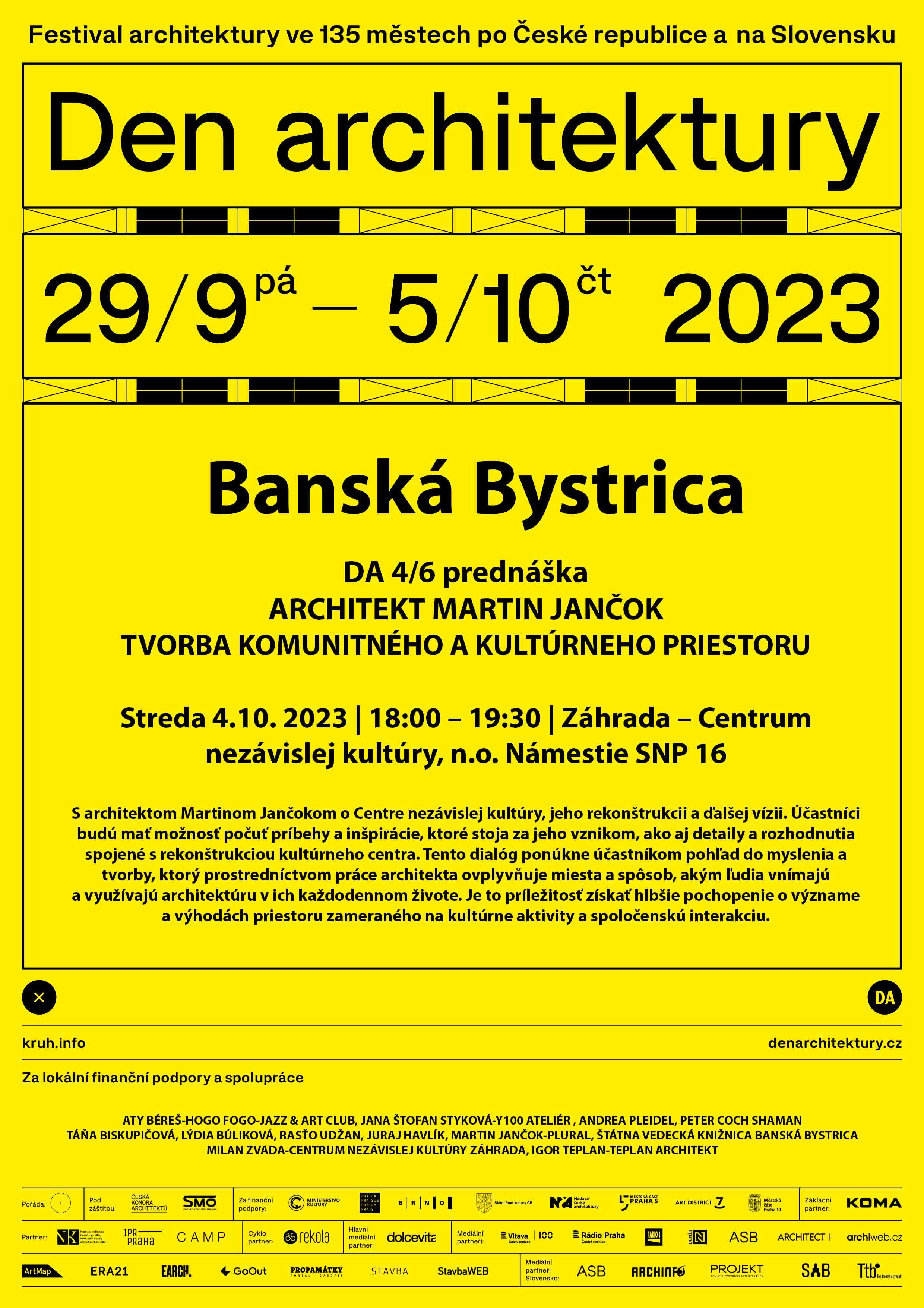 S architektom Martinom Jančokom o Centre nezávislej kultúry, jeho rekonštrukcii a ďalšej vízii. Účastníci budú mať možnosť počuť príbehy a inšpirácie, ktoré stoja za jeho vznikom, ako aj detaily a rozhodnutia spojené s rekonštrukciou kultúrneho centra. Tento dialóg ponúkne účastníkom pohľad do myslenia a tvorby, ktorý prostredníctvom práce architekta ovplyvňuje miesta a spôsob, akým ľudia vnímajú