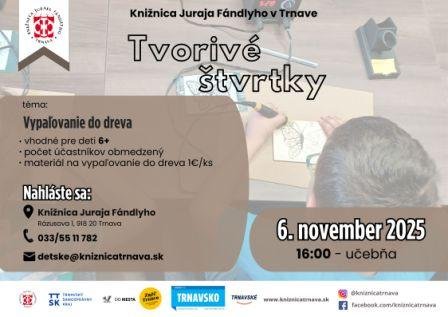 V rámci inteligentného laboratória SmartLab pozývame všetky šikovné deti do štvrtkovej tvorivej dielničky. Téma: Vypaľovanie do dreva, vhodné pre deti 6+.