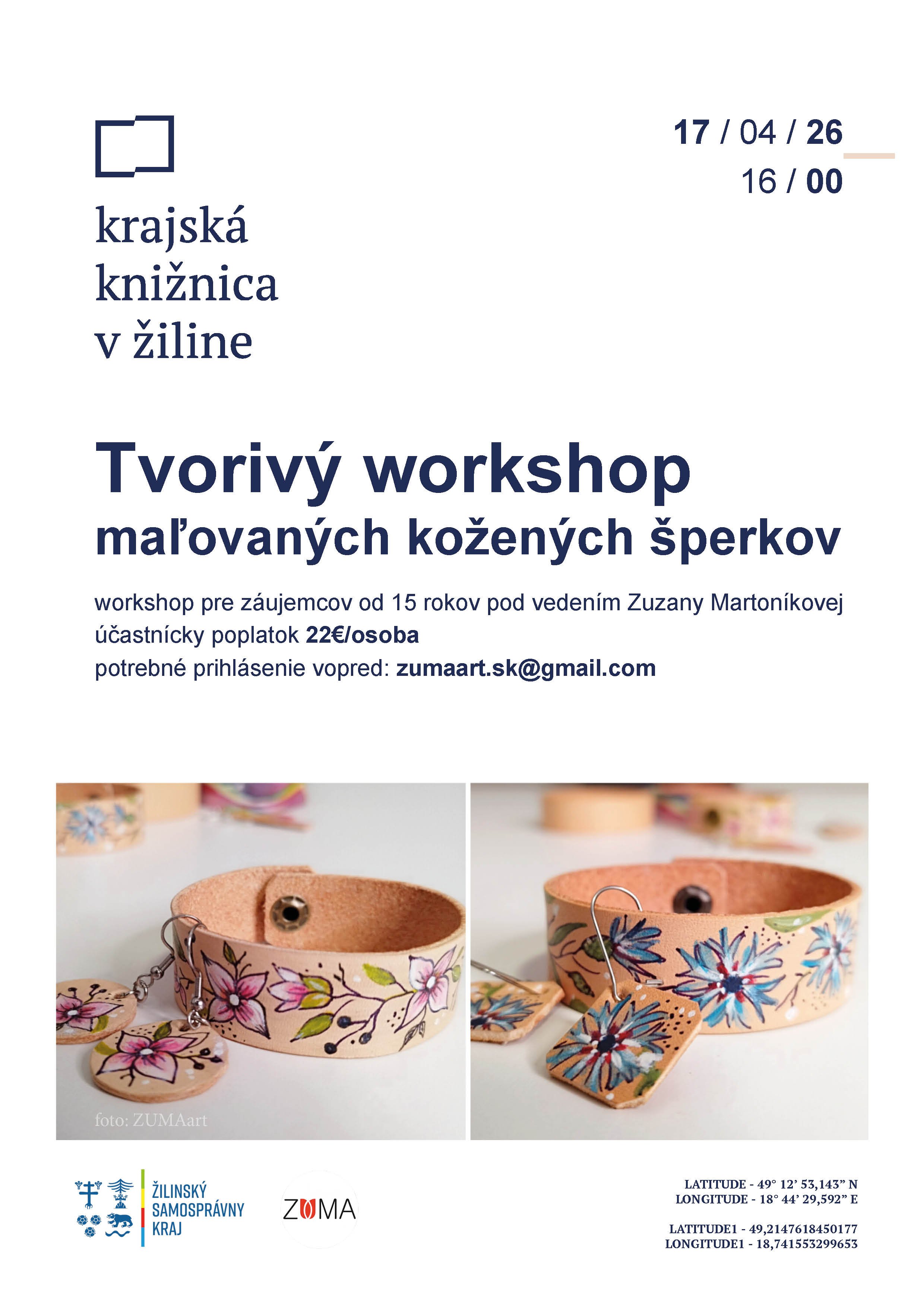 Objavte čaro tvorby originálnych kožených  šperkov na kreatívnom workshope pod vedením Zuzany Martoníkovej (ZUMAart), ktorý sa uskutoční 17. 4. 2026 o 16.00 v Krajskej knižnici v Žiline. Podujatie vychádza z jej autorskej umeleckej tvorby, dlhodobého výskumu a praxe a ponúka jedinečný pohľad do procesu vzniku umeleckého diela. Počas workshopu si účastníci vyskúšajú originálne techniky maľovania na kožu, nahliadnu do autorského tvorivého procesu a budú mať priestor na vlastnú tvorbu aj reflexiu.