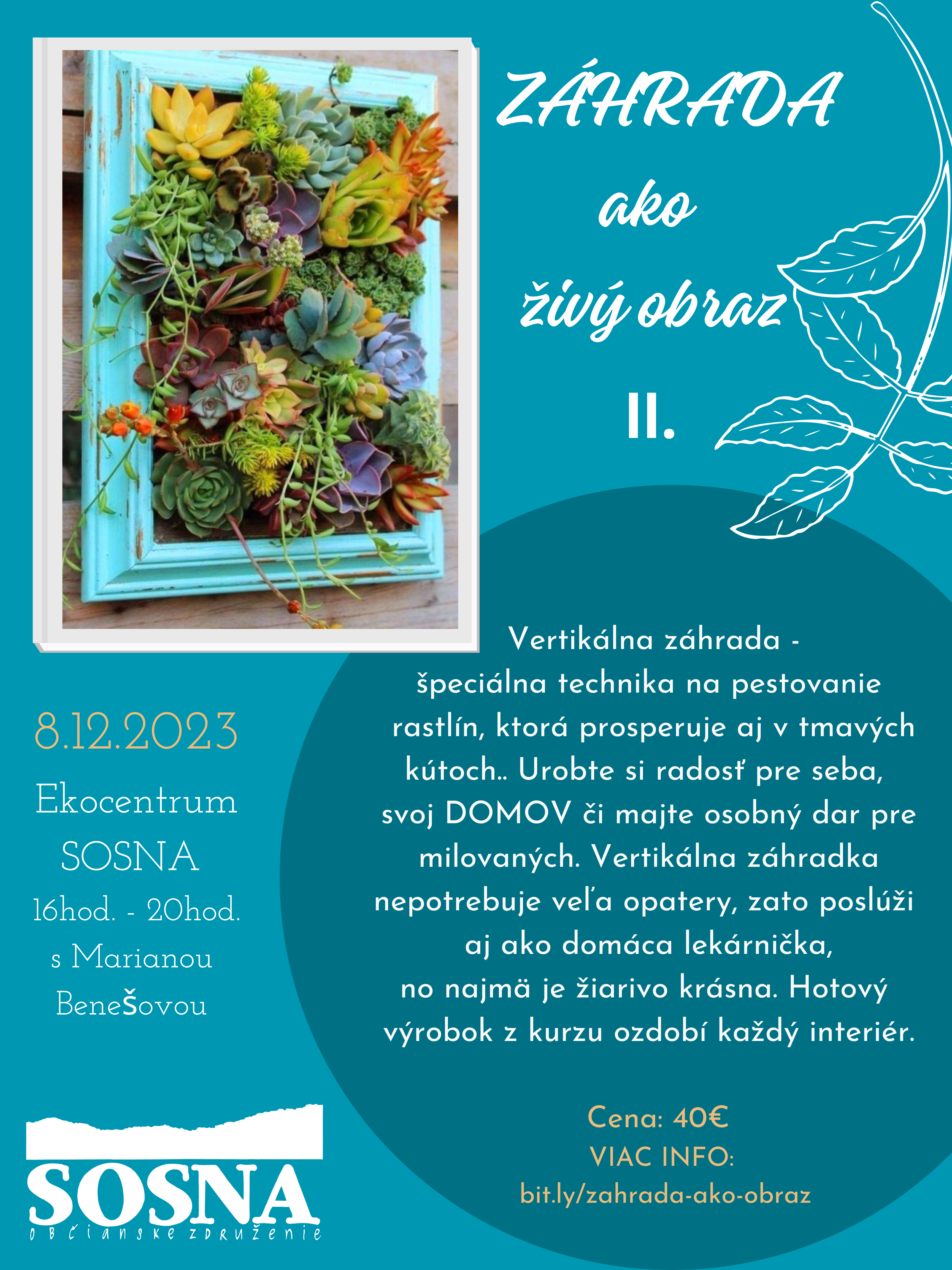 rastlín, ktorá prosperuje aj v tmavých kútoch.. Urobte si radosť pre seba, svoj DOMOV či majte osobný dar pre milovaných. Vertikálna záhradka nepotrebuje veľa opatery, zato poslúži aj ako domáca lekárnička, no najmä je žiarivo krásna. Hotový výrobok z kurzu ozdobí každý interiér.