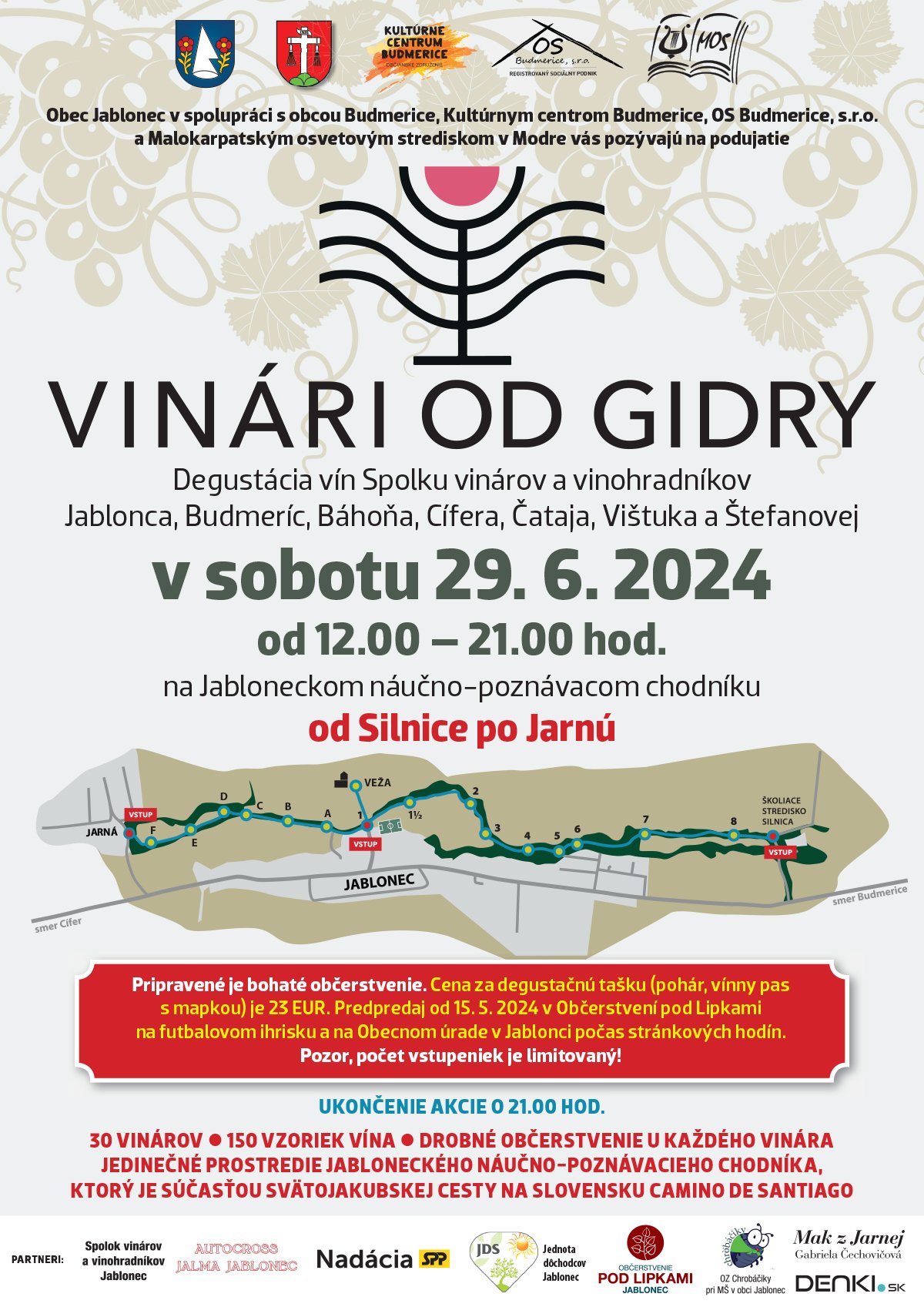 Na malebnom Jabloneckom náučno – poznávacom chodníku od Silnice (Budmerice) po Jarnú (Cífer) popri Gidre Vám 30 vinárov z Jablonca, Budmeríc, Báhoňa, Vištuka, Štefanovej ponúkne vyše 150 vzoriek vín.