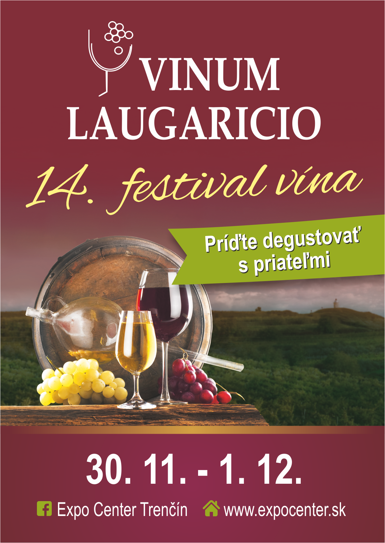 Jedinečný zážitok z degustácie špičkových vín zo Slovenska a zahraničia ponúkne 30.11 -1.12. v areáli Expo Centra Trenčín 14. ročník festivalu vína VINUM LAUGARICIO. Návštevníci budú mať možnosť počas podujatia degustovať súťažné vzorky vína a destilátov vo verejnom degustačnom stánku ako aj vzorky samotných vystavovateľov, ktorých bude viac ako 50 /napr. Malokarkarpatská vínna cesta, Vínna cesta Záhorie, Hamsik Winery, Freistadt Hlohovec, Tokaj, Ostrožovič, PD Čachtice a ďalší./ Degustácia vín sa bude konať formou žetónov. Nebude chýbať ani gastro zóna /Koliba, Mliečna farma Braunvieh, Milktrade/ či Caffe Bristot. Degustáciu výborných vín v kruhu priateľov vám spríjemní ĽH Lazarovci a Škrupinka.
