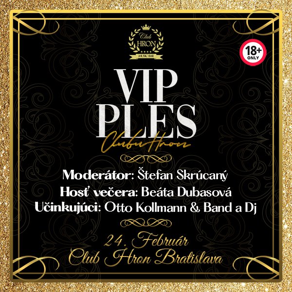 Tak, ako každý rok, tak aj tento nesmieme vynechať VIP ples v clube HRON. Samozrejmosťou je každý rok moderátor a náš dobrý kamarát ŠTEVO SKRÚCANÝ. Rozveselia vás OTTO KOLLMAN & BAND a DJ. Hosť večera BEÁTA DUBASOVÁ, je príjemné spestrenie večera. Staré známe hity, ktoré pozná snáď každý, zaznejú v tento úžasný večer. Budeme radi, ak dodržíte dress code, ktorý samozrejme necháme na vás! Snáď neprídete v rifliach….prosíme niečo elegantné…