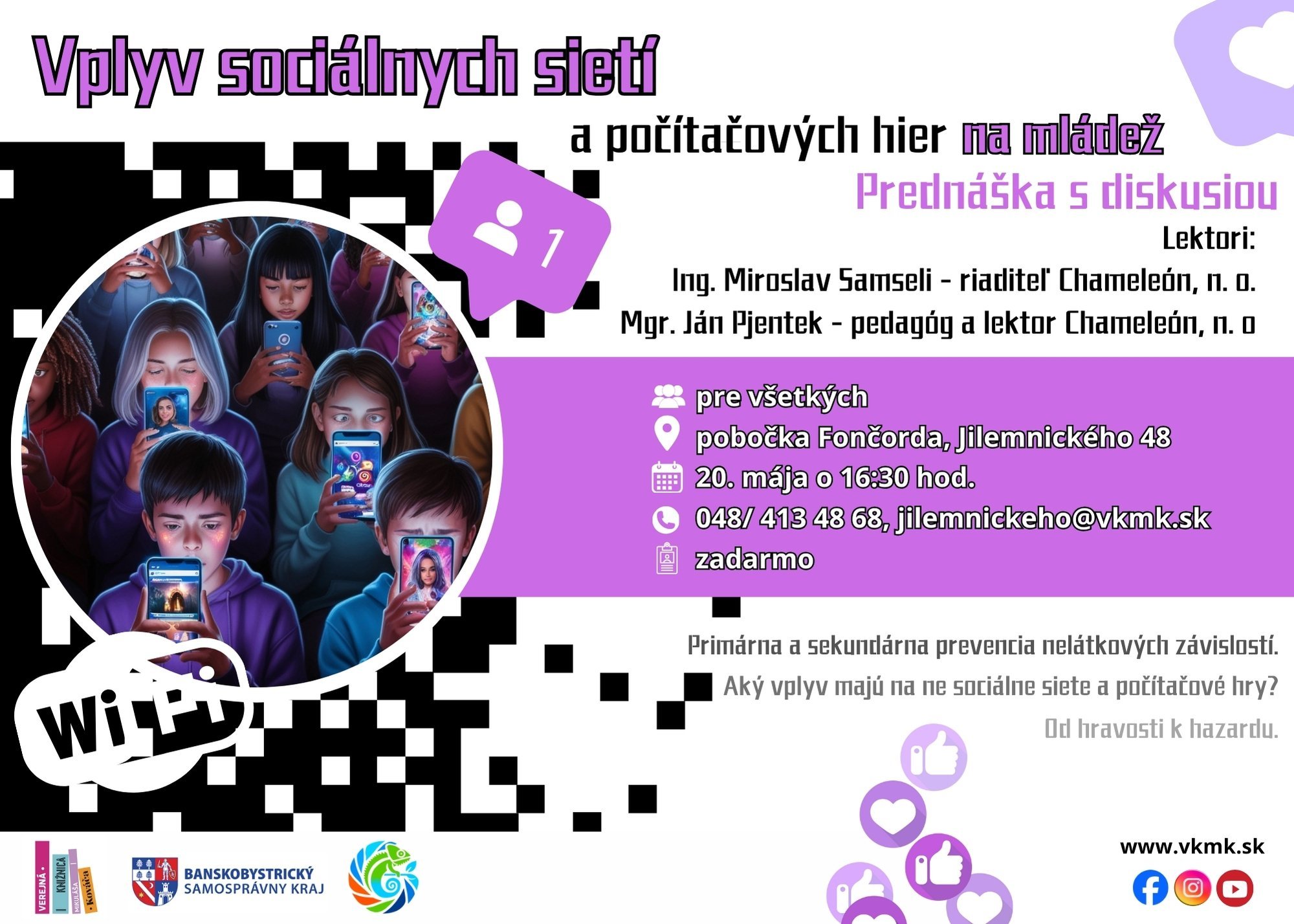 . Hovoriť o tom, aký vplyv majú sociálne siete a počítačové hry na deti a mládež budeme s 2 pánmi z organizácie Chameleón, n.o. - s jej riaditeľom Ing. Samselim a s lektorom Mgr. Pjentekom. Už: