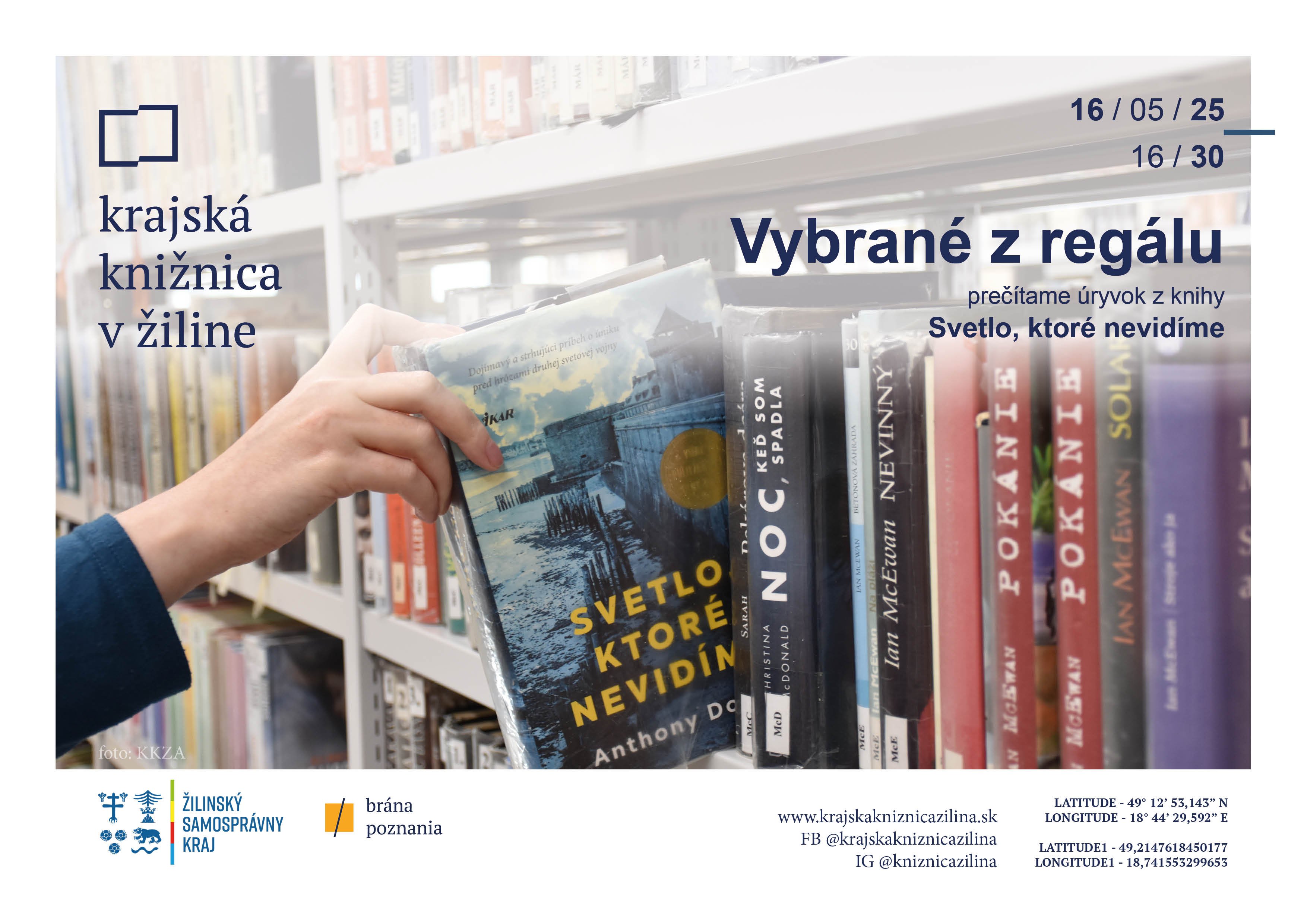 Tiež nemáš čas čítať? Prídi v piatok 16. mája o 16:30 do Krajskej knižnice v Žiline, kde ti prečítame úryvok z knihy Svetlo, ktoré nevidíme od autora Anthonyho Doerra. Po úryvku ste vítaní zostať na krátku diskusiu.