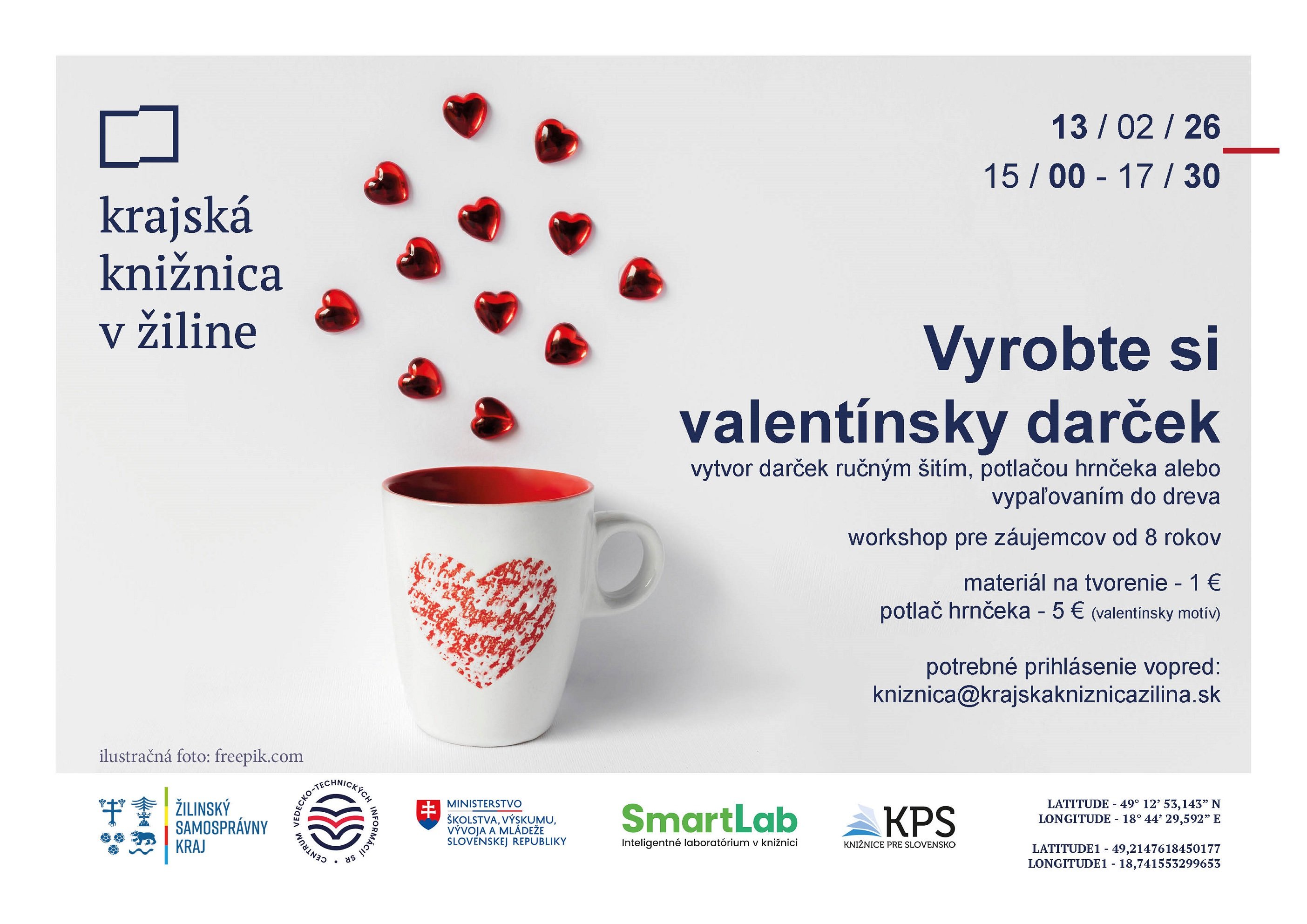 Neviete, čo darovať na Valentína? Zaujíma vás, ako si vyrobiť zaujímavý valentínsky darček? Príďte si užiť tvorivé popoludnie v piatok 13. februára od 15:00 do 17:30 do Krajskej knižnice v Žiline a odnesiete si originálne darčeky. Môžete sa tešiť na tvorenie valentínskych darčekov ručným šitím, potlačou hrnčekov a vypaľovaním do dreva. Čaká vás uvoľnená atmosféra, kreatívne dielne a inšpiratívne prostredie. Na podujatie je potrebné prihlásenie vopred: kniznica@krajskakniznicazilina.sk