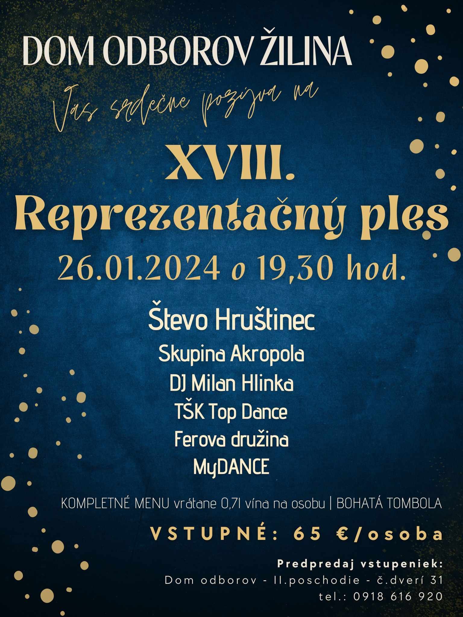 DOM ODBOROV ŽILINA Vás srdečne pozýva na XVIII. reprezentačný ples, ktorý sa uskutoční dňa 26.01.2024 /piatok/ o 19,30 hod.