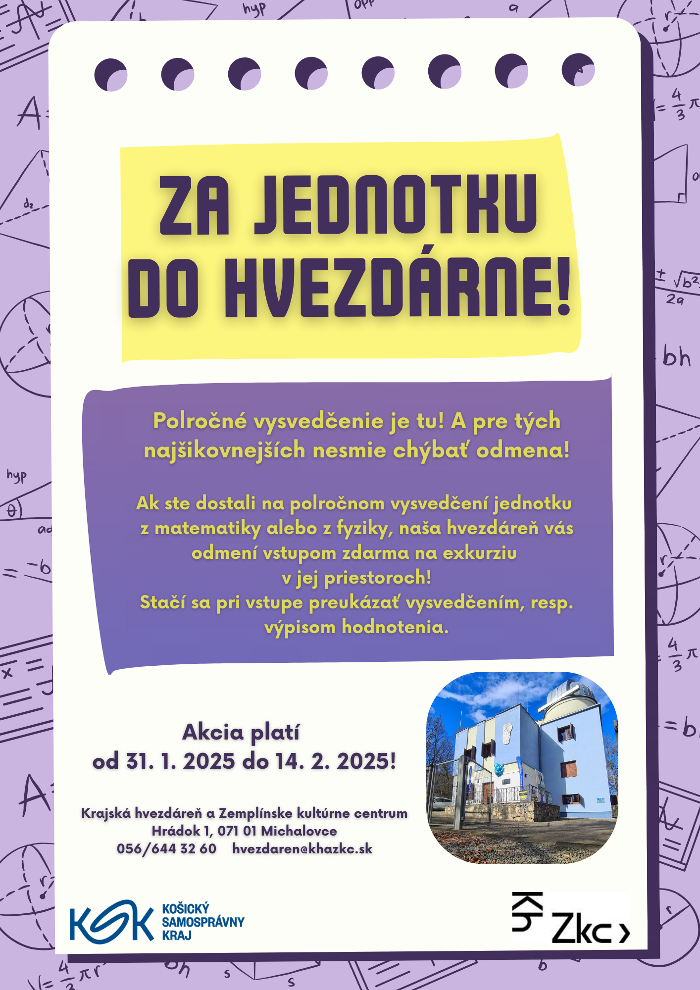 Ak máš na polročnom vysvedčení jednotku z matematiky alebo z fyziky, naša hvezdáreň ťa odmení vstupom zdarma na exkurziu v jej priestoroch. Stačí sa pri vstupe preukázať vysvedčením alebo výpisom z hodnotenia.