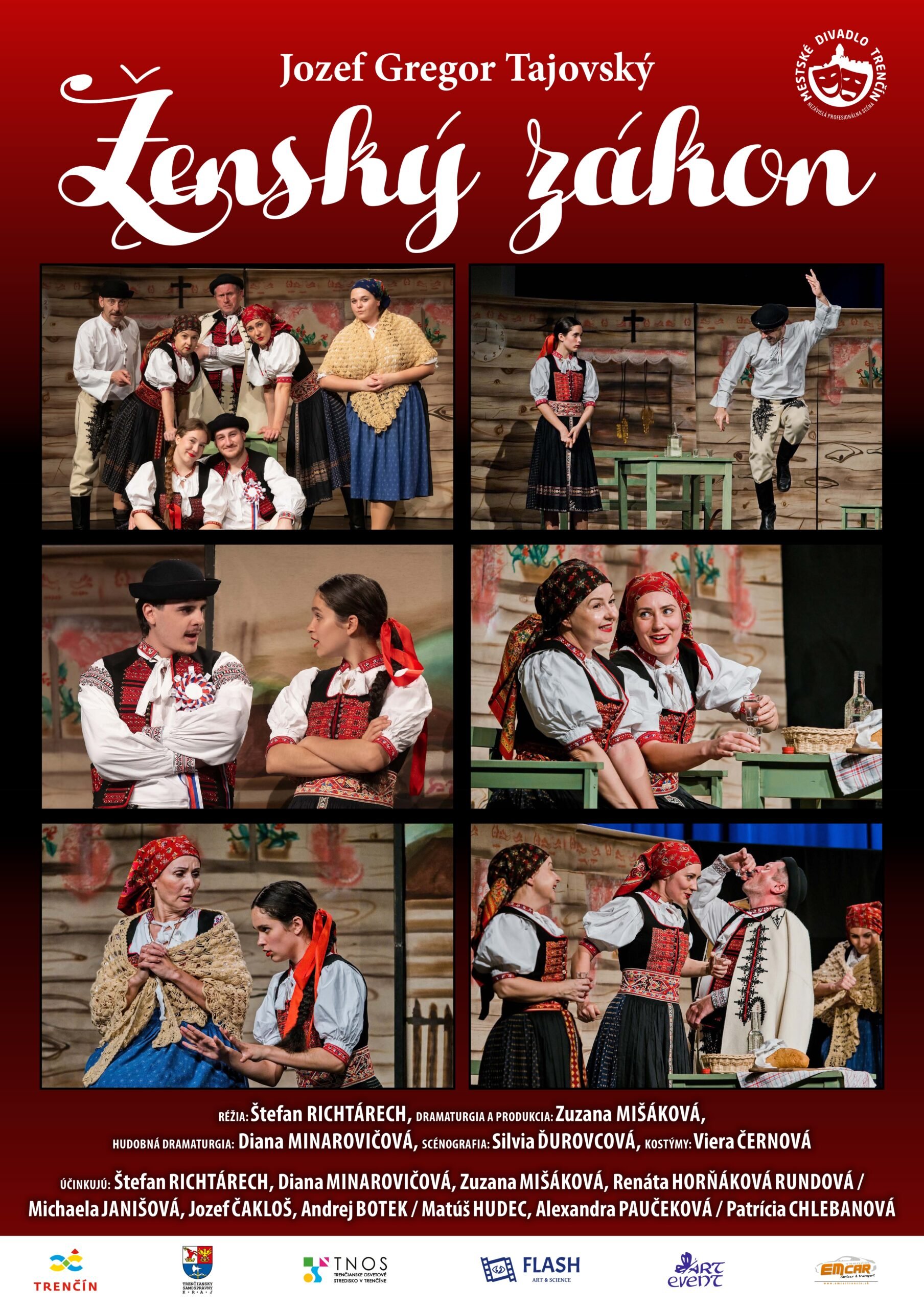 Opäť sa vraciame ku svojim koreňom a na žiadosť divákov obnovujeme klasiku slovenskej dramatickej spisby – Ženský zákon od Jozefa Gregora Tajovského, zakladateľa slovenského divadelného realizmu. Prinášame vám pôvodnú veselohru v nezmenenej podobe – zažijete dedinskú atmosféru začiatku 20. storočia s originálnymi krojmi z oblasti Soblahova pri Trenčíne, ľudovými spevmi priamo na javisku a s malichernými spormi a intrigami, ktoré vedia situáciu poriadne zamotať.