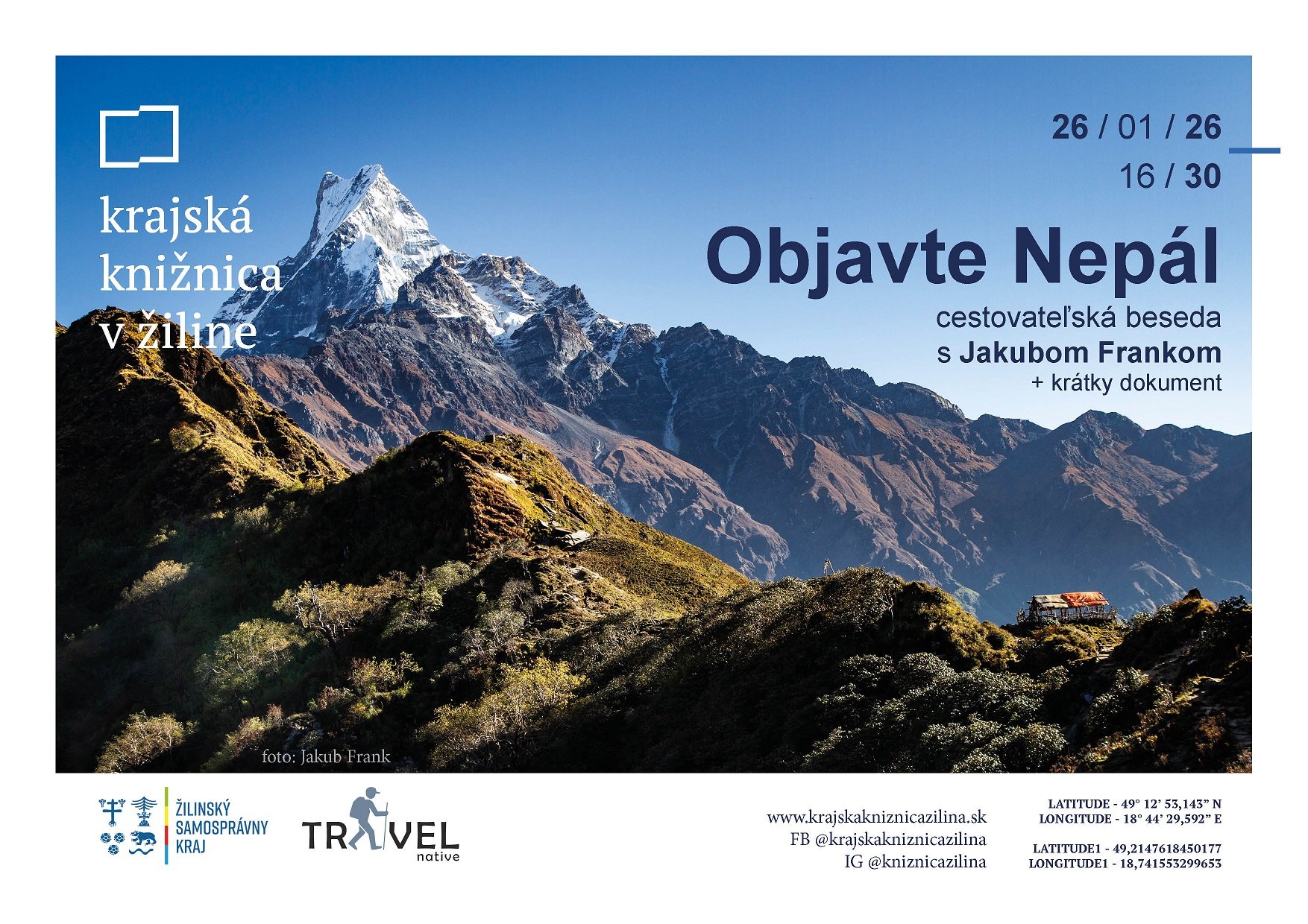 Nepál je malým klenotom medzi dvoma gigantmi. Krajinou, ktorej severnú hranicu lemuje najvyššie pohorie sveta, pod ktorým žije národ usmiatych ľudí s otvoreným srdcom. Príďte si vypočuť zážitky Jakuba Franka z mnohých ciest Nepálom v pondelok 26. januára o 16:30 do Krajskej knižnice v Žiline. Môžete sa tešiť na fotky z oblasti Annapurny, Everestu, Manaslu, Langtangu a Kančendžongy.